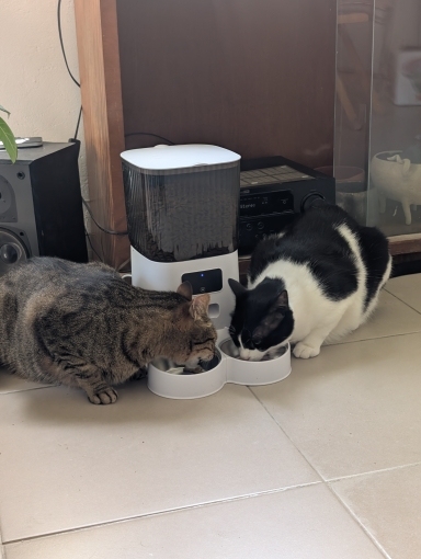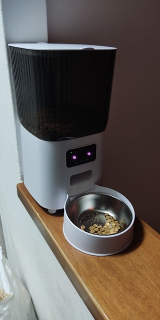 I’ve been using it for a week and I’m delighted. Programming the food is simple; you have to set how many portions of food you want to come out in the hours you program (each portion is approximately 5g). Also, you need to remember not to fill the tank to the top because otherwise the food doesn’t come out well, and there is a feeder that comes out more than another (but it’s difficult to make each cat eat in one and not in the other, so that’s why it doesn’t pose much of a problem for me).